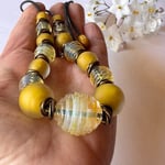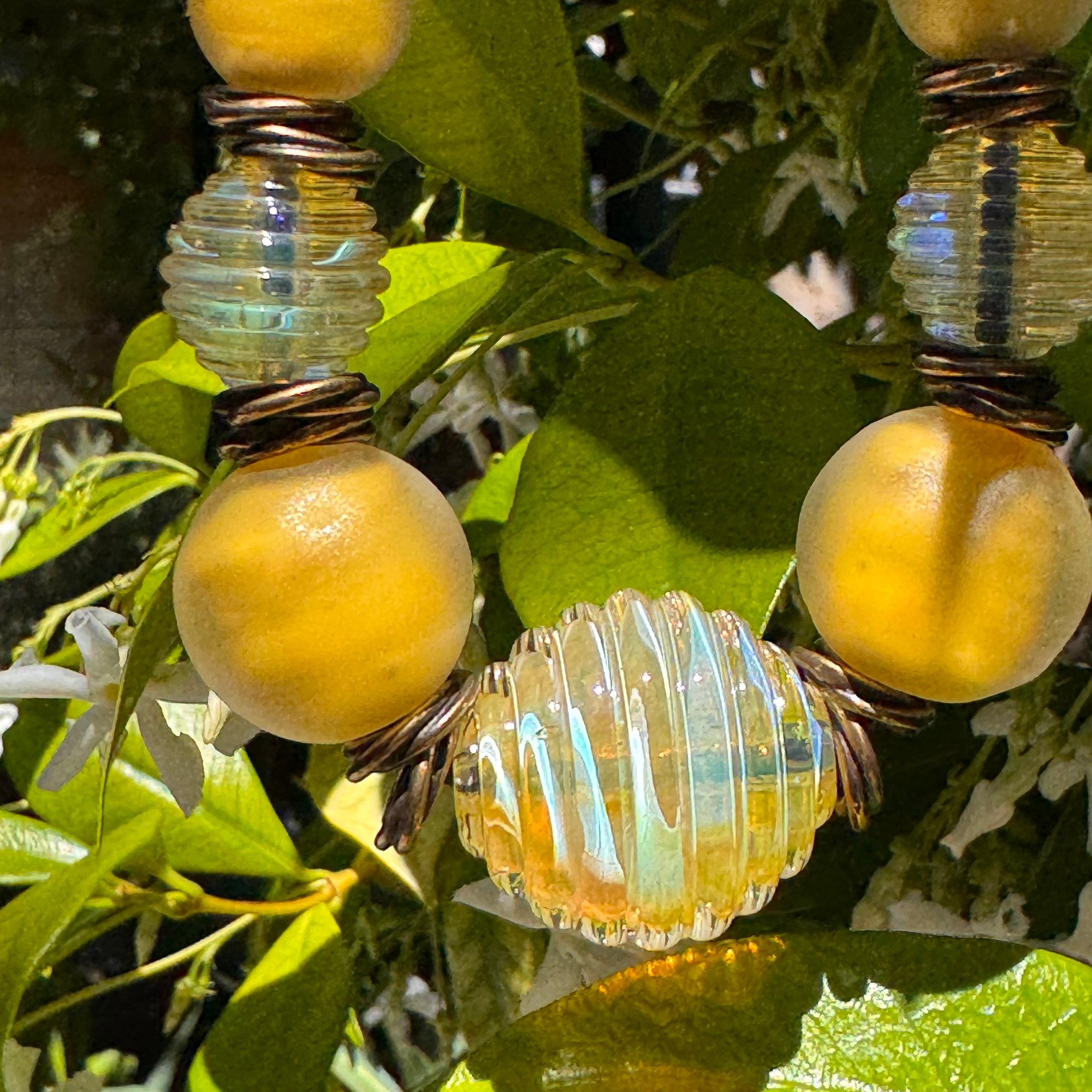 Mustard round beads are an opaque mustard yellow encased in clear glass and etched to a matt finish.