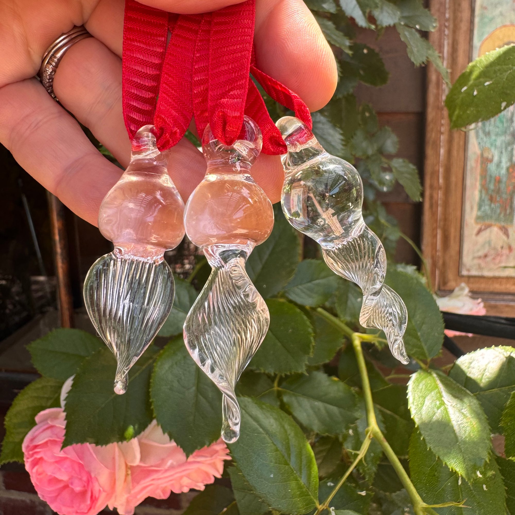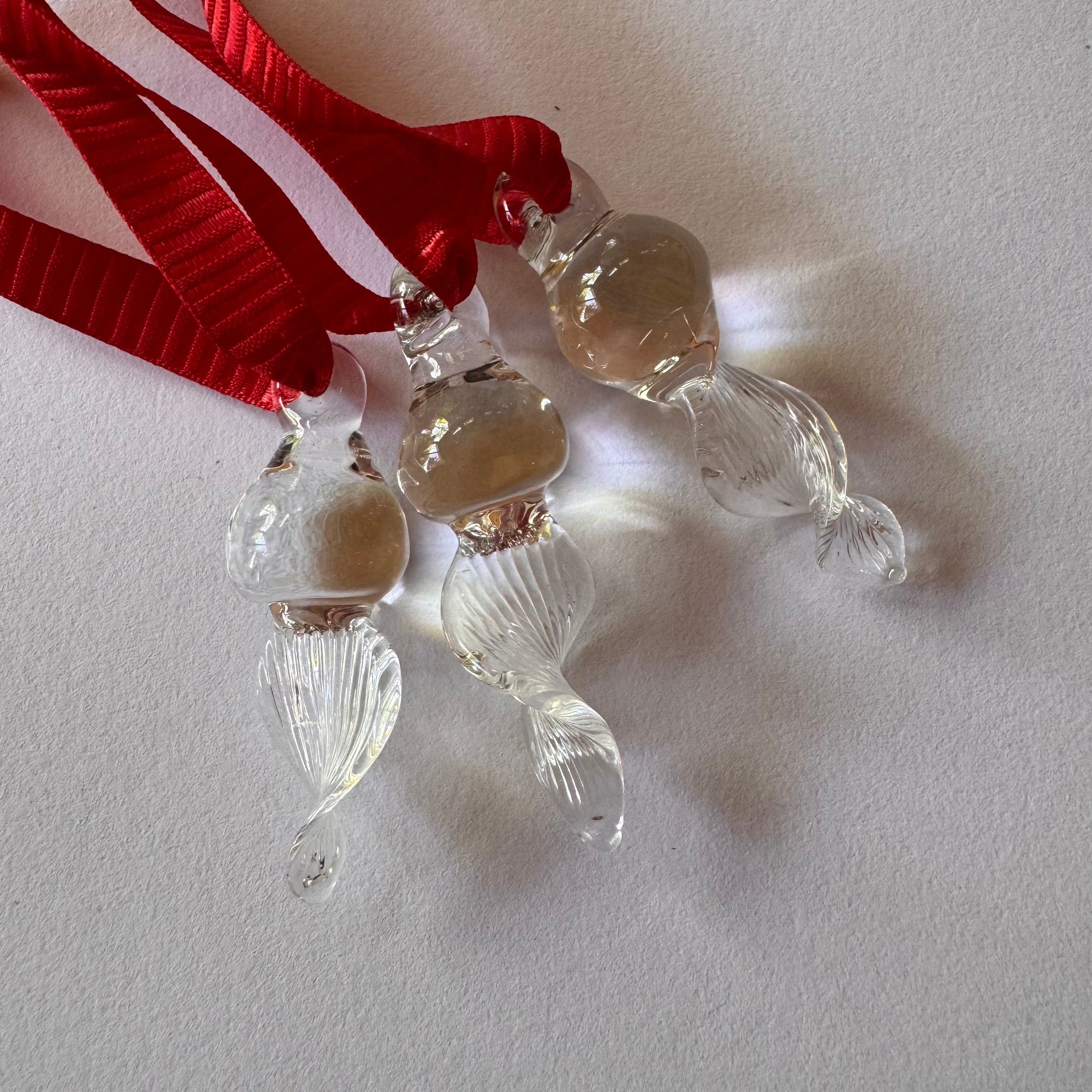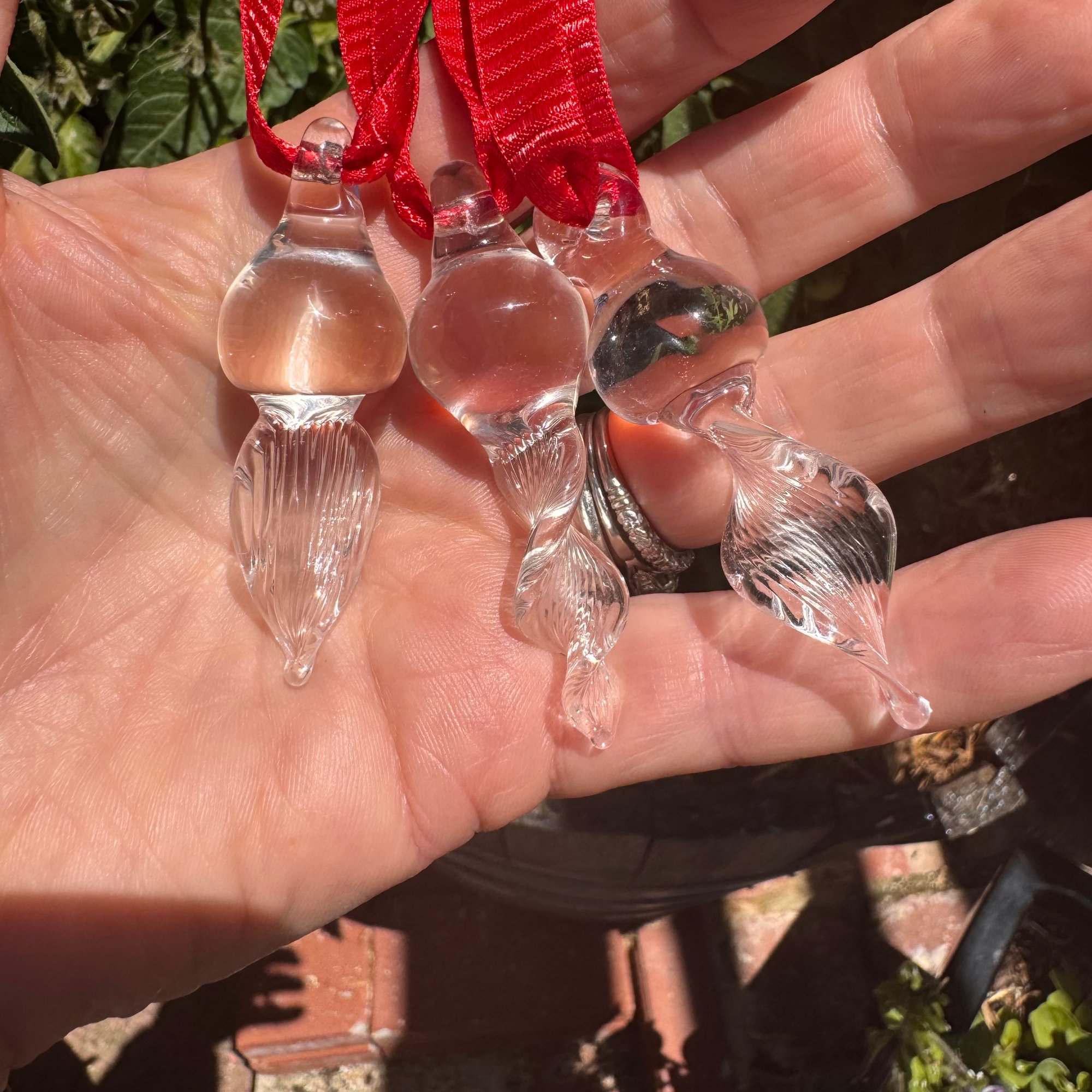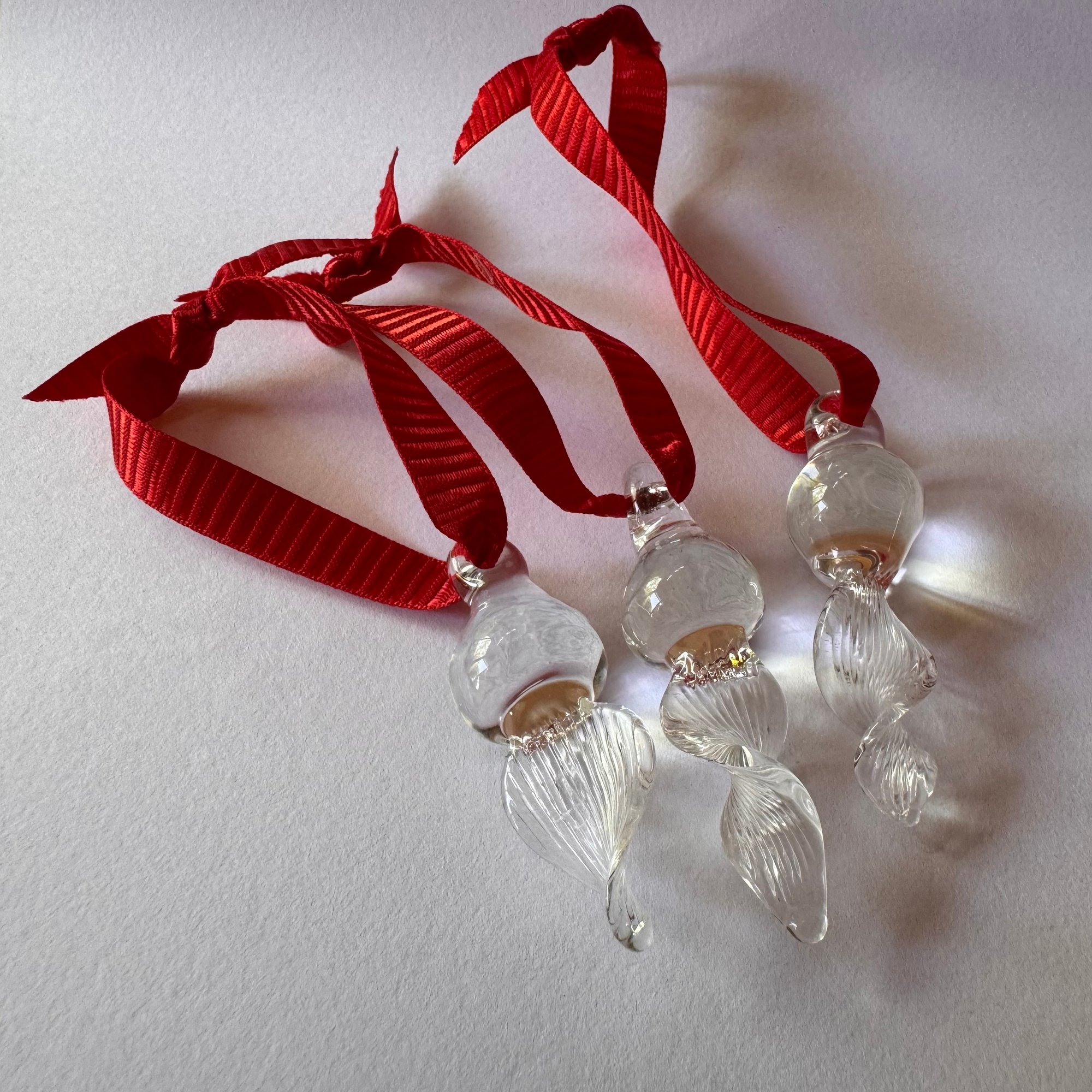 A set of three handmade borosilicate glass ornaments supplied with red ribbon.